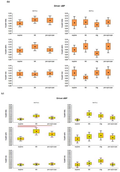 - in the phase IIb (nitroglycerin administration): HUTT(-) manifested the highest value of TE for the SV driver to the following targets: RRI, sBP and dBP (Figure 3c).