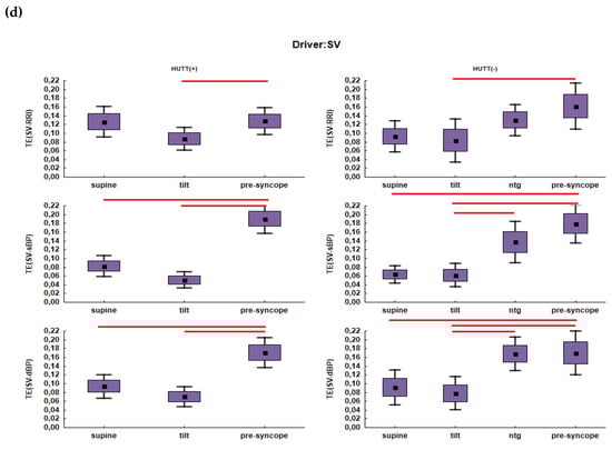 Transfer Entropy (TE) in consecutive HUTT phases for the HUTT(+) (on the left) and HUTT(−) group (on the right) for the following drivers: (a) RRI, (b) sBP, (c) dBP, (d) SV.