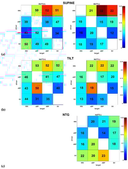 In each matrix the single element is a number of statistically significant TE (driver-target) obtained for the analyzed group of patients (in HUTT(+) group n = 57, in HUTT(-) group n = 23). The determination of significance of TE was described in Section 2.4.