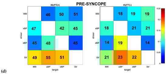 Figure 3 (panels a–d) presents TE matrices separately for the HUTT(+) (left side) and HUTT(-) group (right side). Each element of the TE matrix represents average TE of the results obtained for all patients. The magnitude of TE is color-coded. Each number expresses the number of significant links of corresponding pair driver-target.