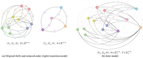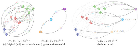 - A vertex set , which is the union of all state vertices in and . For simplicity, we assume that the vertex set for the intermediate transition model is indexed such that the first m nodes are from and the remaining n nodes are from .
