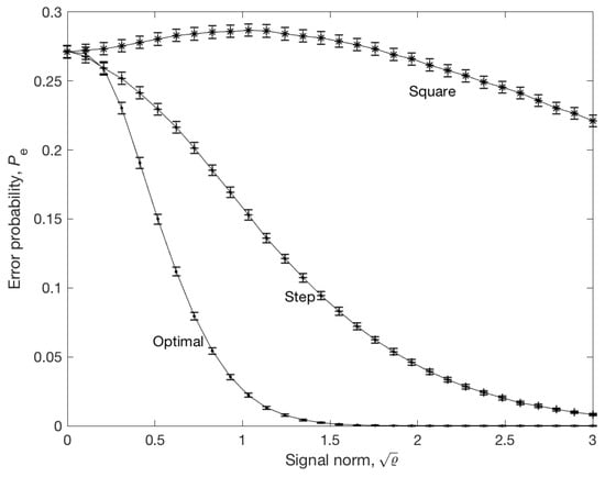 Let denote the normalized step and square signal with period of three, respectively, and let denote the optimal signal. To check the validity of the results, the error probabilities , , and were estimated by Monte Carlo simulation with trials and steps. The results are shown in Figure 2. It was observed that the optimal signal gives an error probability several thousand times smaller than the step or square signal with the same energy. The second observation is that initially increased with . To explain this, let us note that Inequality (17) does not guarantee that is decreasing function of . Hence, it is possible that increases in certain directions, although Theorem 2 guarantees that tends to zero, provided that signal norm tends to infinity.