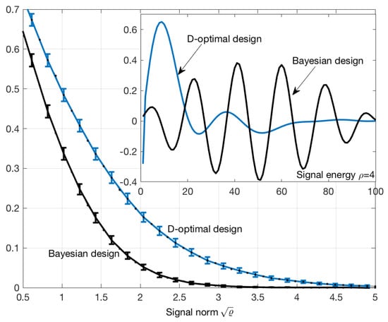 Error probability of theMAP estimator (see Section 2), as a function of signal norm and the exemplary input signals (top right) generated by D-optimal and Bayesian methods. The error probability was calculated by a Monte Carlo method with trials. Standard error bars were multiplied by a factor of 10 for better visibility.