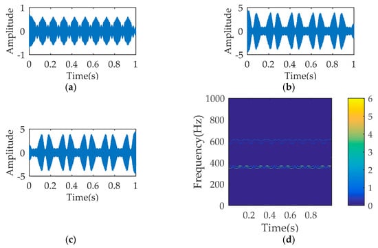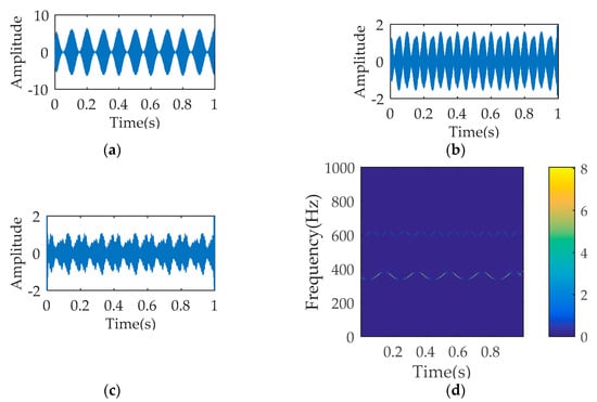 Figure 1 describes the temporal waveform of the single signals and the synthetic signal. The process results of SWD are illustrated in Figure 2. As seen, the decomposition signals basically restore the waveform characteristics of the raw single signal, although leading to the distortion of amplitude. The time-frequency diagram corresponding to SWD reflects the 350 Hz component and the 700 Hz component. The multi-component signal is also processed by VMD and EMD respectively. The parameters K and α of VMD equal to 4 and 1000. Figure 3a–c describes the first three decomposition signals of VMD, which cannot restore the waveform characteristics of the original single signal. In Figure 3d, the 350 Hz component and the 700 Hz component appear, but the over decomposition phenomenon also appear. The parameters of VMD are changed several times, but the decomposition results are not ideal. Figure 4 is the analysis results of EMD, where the decomposition components cannot restore the original signals, and the time-frequency diagram cannot reflect the useful frequency information either.