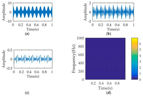 The analysis results of variational mode decomposition (VMD): (a) temporal waveform of decomposition signal 1; (b) temporal waveform of decomposition signal 2; (c) temporal waveform of decomposition signal 3; (d) time-frequency diagram.