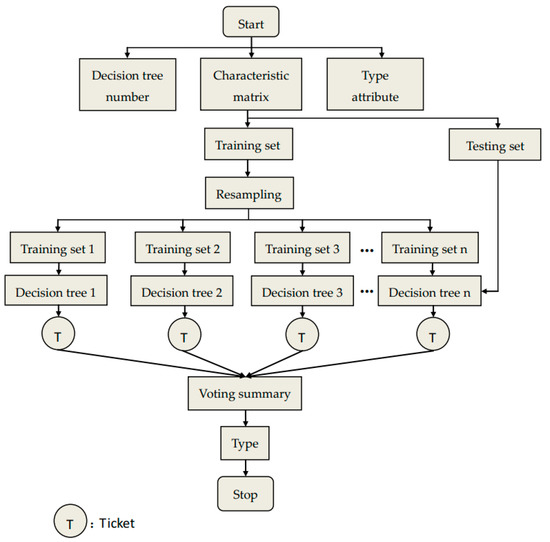Random forest (RF) is an ensemble learning model based on decision tree classifier, which contains several decision trees trained by Bagging ensemble learning technology. When inputting the samples to be classified, the final classification result is determined according to the output of a single decision tree. RF algorithm consists of the following steps, and Figure 8 is the flow chart of RF algorithm.