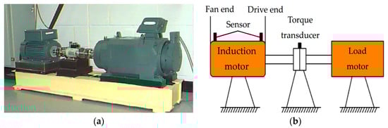 The open data set of Case Western Reserve University (CWRU) has helped many researchers to validate new technologies, theories, and technologies [44]. Figure 10a,b are the physical photo and sketches of the experimental platform of CWRU. As shown, the left part is an induction motor as the driving source, a torque transducer is arranged in the middle, and the right part is a load motor. The rolling bearing supporting the spindle is the tested object, and its surface of inner ring, outer ring, and rolling element has pitting defective processed by electric discharge machining technology, respectively. The pitting diameters of each position are 0.007, 0.014, 0.021, and 0.028 inches respectively.