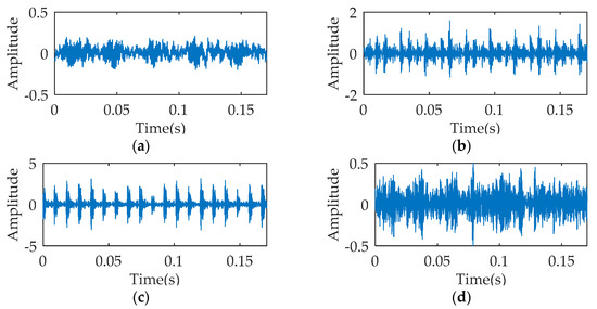 Temporal waveform of one data sample under four operation states: (a) normal (NOR); (b) inner ring fault (IRF); (c) outer ring fault (ORF); and (d) rolling element fault (REF).