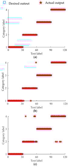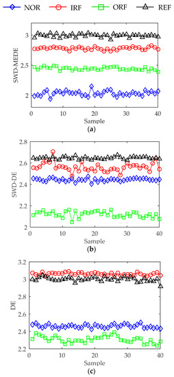 According to the identification method proposed in Section 5, the vibration signals of each sample are decomposed by SWD, and the PSCs are selected to calculate their MEDE. Figure 12a illustrates the results, where the MEDE of rolling bearing signals under four operate states can be well distinguished and have good stability. The DE method (i.e., the DE of raw sample data is calculated directly), the SWD-DE method (i.e., the raw sample data is firstly decomposed by SWD, and then the DE of POC is calculated) also processed the data samples, with the results of feature extraction described in Figure 12b,c. The features under normal state and outer ring fault can be clearly separated, while the features under other two fault types have some shortcomings such as overlapping and being hardly distinguished. Compared to the SWD-DE approach, the DE approach is less effective in extracting features. In conclusion, the SWD-MEDE approach has excellent performance on feature extraction, and the extracted features have a great degree of discrimination that is able to recognize different operation states.