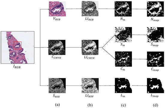 - . To compute this feature, first, we acquire a toroid region by subtracting the masks relative to the gland and lumen candidates, and , respectively, according to . Then, we calculate the number of pixels associated with the nuclei and cytoplasm masks, and , inside the toroid region, as follows: