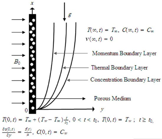 Assume the unsteady unidirectional MHD free convectional flow of an incompressible viscous fluid over a vertical unbounded plate. As shown in Figure 1, the has been taken along the plate and axis is perpendicular to the plate correspondingly. At the start, the fluid and plate both are at relaxation with (constant wall temperature). After a while, along the axis the plate interrupts the fluid by time dependent shear stress . Equivalently the temperature of the fluid is decreased or increased to when and afterwards for is continued at . An unchanging magnetic field of strength is applied normal ally to the flow path. Considering the fluid is in the porous half space, the flow is laminar and ignoring the viscous dissipation by using Boussinesq’s approximation, by Butt et al. [] the governing equations of the flow are given. The continuity, momentum, energy and concentration equations for the boundary layer flow are written as,