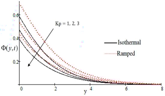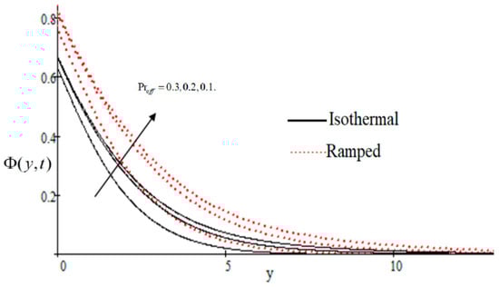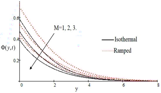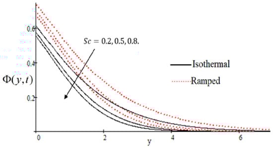 In Figure 2, it has perceived that the velocity profile is reducing with increasing M in both ramped and isothermal wall temperature situations. Actually, it is because of an increase in magnetic field M which leads the frictional force to decrease and causes it to resist the flow of the fluid, therefore velocity decreases. The effect of inverse permeability parameter over isothermal and ramped walls have been seen in Figure 3. It is noticed from the graph that velocity is decreasing with an increase in . This effect occurs due to the porous medium, which is an increasing that strengthens the resistance and consequently decreases the velocity. The influence of shear stress is showed in Figure 4 where we noticed that when the value of decreases, the velocity of fluid increases. In Figure 5 it is shown that when the value of effective prandlt number is decreased, the velocity increases for both isothermal and ramped walls. The influence of Grashof number on the velocity is shown in Figure 6, where it has observed that velocity increase with increasing The influence of modified Grashof number on the velocity is also increasing, it increases the velocity more rapidly than showed in Figure 7. The effect of Schmidt number is shown in Figure 8. It is detected that by increasing the value of , the velocity decreases.