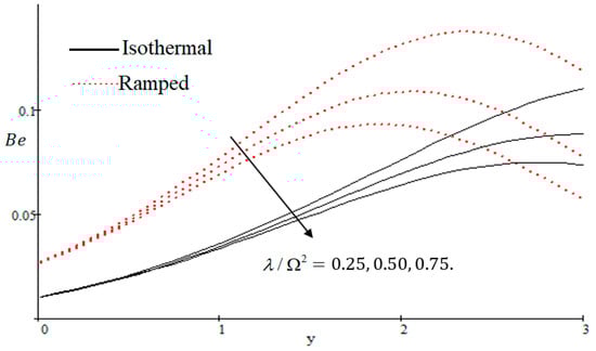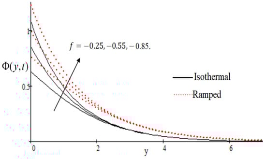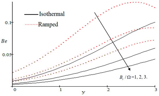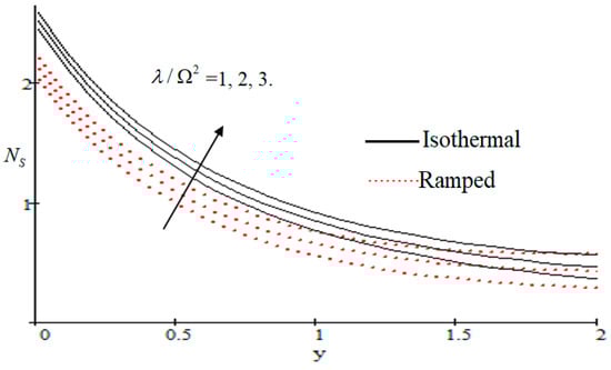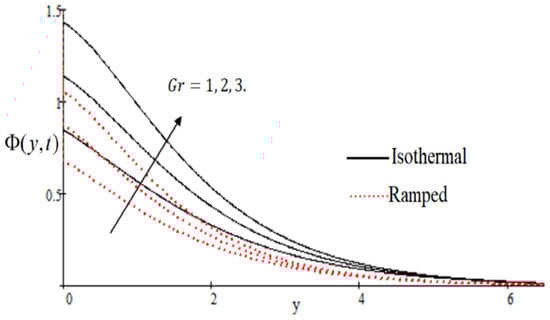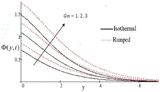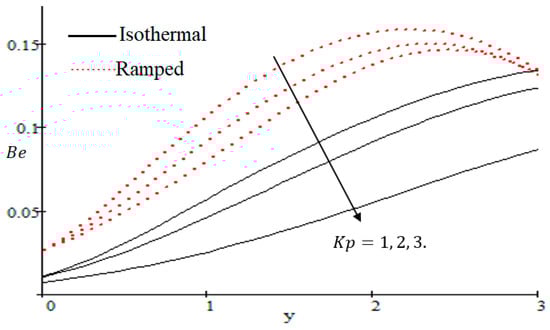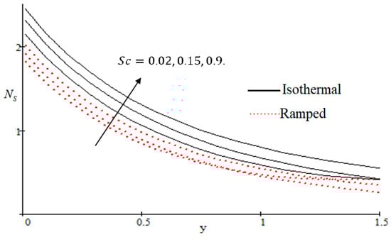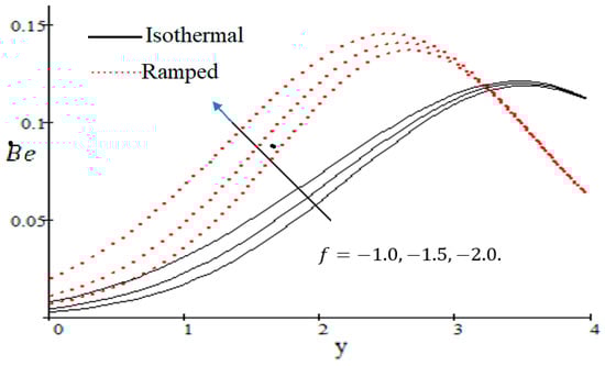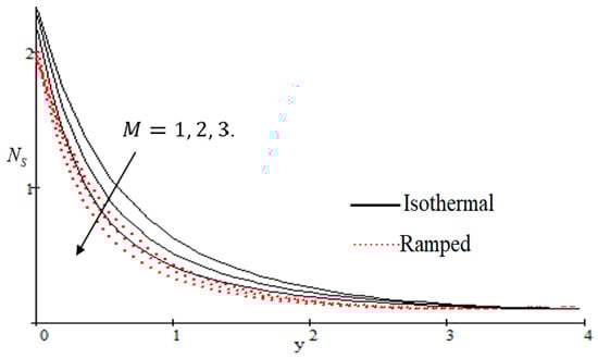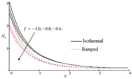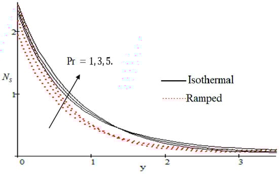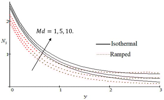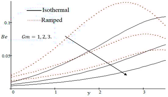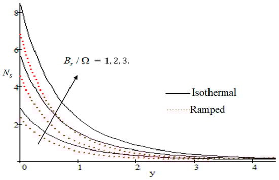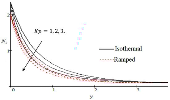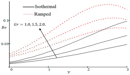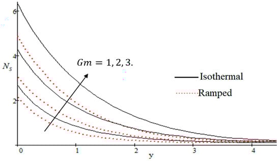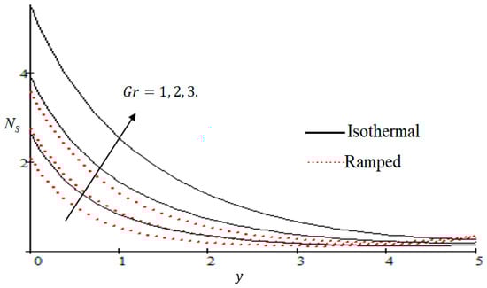 Properties of embedded parameters on are highlighted in Figure 9, Figure 10, Figure 11, Figure 12, Figure 13, Figure 14, Figure 15, Figure 16, Figure 17 and Figure 18. The effect of Grashof number is shown in Figure 9. It is seen that increases with the increasing value of . The influence of wall shear stress is presented in Figure 10, where it is noticed that decreases with increasing , therefore the rate of entropy generation can be reduced by increasing the value of . In Figure 11, it is noticed that decreases after increasing the value of . The effect of group parameter over is highlighted in Figure 12, where it is observed that is the increasing function of group parameter . The graphical result shows that group parameter has an important ability to control . The Brinkman group parameter regulates significance of viscous effects and it is also noticed that this parameter is associated with the fluid viscosity term. The brinkman group parameter appears directly proportional to the square of the velocity and an increase in it evidently accelerates flow and as a result entropy will increase. The effect of inverse permeability parameter is shown in Figure 13. It is seen that a decrease in occurs with an increase in for both ramped and isothermal walls temperature. The reason behind this fact is that the entropy generation is an increasing function of dissipative forces. Further, the impact of is more prominent at the stretching boundary whereas the effects die out in the region away from the boundary. In Figure 14, the value of magnetic parameter is increased with the increasing . The increasing graph of is shown in Figure 15. A rapid increase in occurs with the increasing value of . The effect of the Schmit number over the local entropy generation rate is highlighted in Figure 16. It is observed that increases with increasing value of . The effect of mass diffusion parameter is shown in Figure 17. It is detected that when increased is also improved. In Figure 18, the influence of group parameter over is shown, which an increasing function of the group parameter.