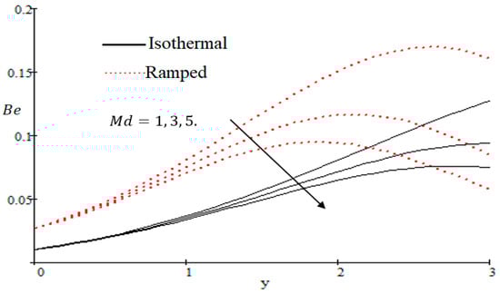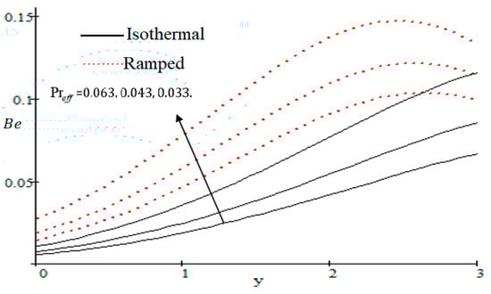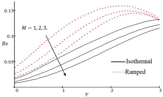 - Rises in, , , , and M leads to decreases of the Bejan number for isothermal and ramped wall temperature individually.
