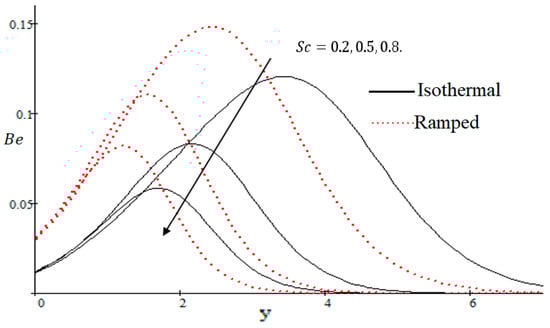 The Bejan number is quite useful, as one can get evidence about dominancy of magnetic field and fluid friction through heat transfer entropy or vice versa. The influence of on the Bejan number is shown in Figure 19. The magnetic field leads to increasing the fluid friction and entropy with a decreasing value of . The heat transfer reunification comes to be dominant in the region near to the plate with an increasing value of , shown in Figure 20, while far away from the plate the friction of the fluid’s irreversibility become powerful and hence the Bejan number is strengthened. Figure 21 showed that the fluid friction entropy and the magnetic field are improved with an increase in the group consideration . Figure 22 explains that the Bejan number because of the magnetic field and the fluid friction becomes minor with an increase in the nearby plate. In Figure 23 it is showed that the fluid friction entropy and magnetic field increased with a rise in the value of , for individually ramped and isothermal plates. Figure 24 showed an increase in the Bejan number with a decrease in . The effect of the Schmit number is showed in Figure 25, where it is observed that the Bejan number is decreasing with an increasing value of . The effect of group parameter over the Bejan number is showed in Figure 26. It is noted that decreases with an increase in . In Figure 27 the influence of is shown and it is observed that decreases with an increase in . The effect of is exposed in Figure 28, where it is seen that the Bejan number decreases with an increasing value of .