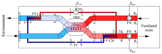 The scheme of a modern air-handling unit (AHU) of a HVAC system is shown in Figure 1. Working fluids linked within energy transformation processes that take place in the AHU are the air that is necessary for ventilation and refrigerant/Freon. The latter device consists of a condenser (CN) and an evaporator (EV), which are connected by a compressor (CM) and a throttle valve (TV) to operate in the reverse cycle.