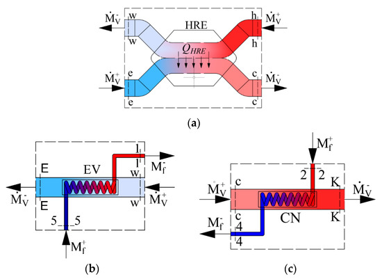 Schemes of energy calculations for components of the AHU: (a) Heat exchanger, (b) evaporator, (c) condenser. —the mass flow rate of Freon (kg/s); —the mass flow rate of the air used for ventilation (kg/s).