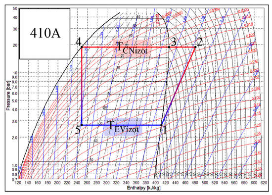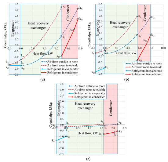 The stable air flow rate of the analyzed AHU is 560 m3/h and power input for fans (supply and exhaust) is 2 × 77 W. The efficiency of the HRE is 70%, the isentropic efficiency of the HP compressor is 0.8, and the power consumption efficiency of the fan is 0.82. The environment (as well as reference) temperature range is Te = −30, …, +10 °C while the room air temperature is 22 °C. Freon is 410a, isotherm in the evaporator is = −30 °C, isotherm in the condenser is = 30 °C (Figure 3.).
