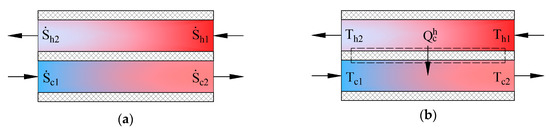 In the second case the process (b) is defined by the transferred heat flow and the input and output temperatures of working fluids. The expression of entropy in the heat transfer process is . The produced entropy is expressed as the difference between the average entropy of the cooler working fluid and average entropy of the hotter working fluid:
