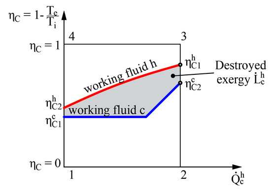 The left side of Equation (12) shows the amount of exergy flow given to the system while the right side shows the obtained amount of exergy flow. It should be noted that regardless of where the value = 0 is in terms of other (e.g., between the values of hot and cold working fluids), the destroyed exergy that defines this process is still the area between these two curves (see Figure 5).