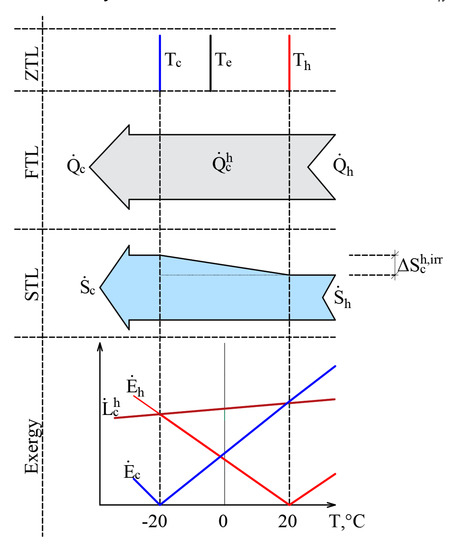 The authors have published papers on the impact of the varying RT on the direction of the exergy flow when the heat flow is stable [20,45]. Here, we have a stationary heat transfer process that is caused by stable temperatures Th = 20 °C and Tc = –20 °C. The selected temperatures are close to the natural environment. The process is shown in Figure 6 from the point of view of the Zero Law of Thermodynamics (ZLT), the FLT, the SLT, and exergy.