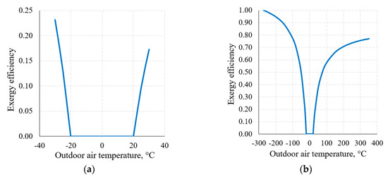 Figure 8b shows this indicator when the RT range, on the basis of the thermodynamic interpretation, is expanded up to the theoretically possible range. Here we can see that the dependency has the maximum ηex = 1 and minimum ηex = 0 values; in addition to this, it is generally not symmetrical with respect to 0 °C (the average value of Th = 20 °C and Tc = −20 °C). The maximum value always corresponds with Te = 0 K. The minimum value ηex = 0 is always within the range between Te = Th and Te = Tc, which, in this case, is (Th = 20 °C, Tc = −20 °C).