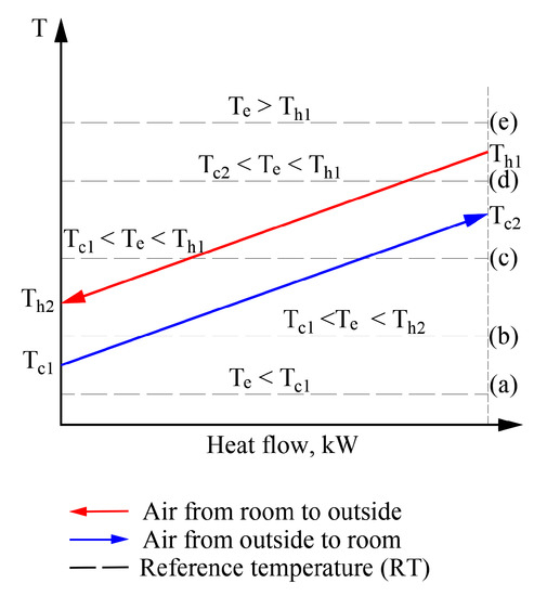 In a real exergy analysis task of HVAC, the variation of the RT has its own behavior over time (which depends on the momentary climate conditions) which can affect the temperatures of working fluids as well. The usual sequence of exergy assessment and calculation, even at a varying RT, is acceptable without the specific properties for cases (a) and (e). In these cases, the numeric value of RT equals, is above or below the temperatures of any working fluid. However, in order to move to a thorough analysis of processes at a varying Te, an algorithm is required to solve the separate cases shown here (e.g., (b), (c), and (d)).