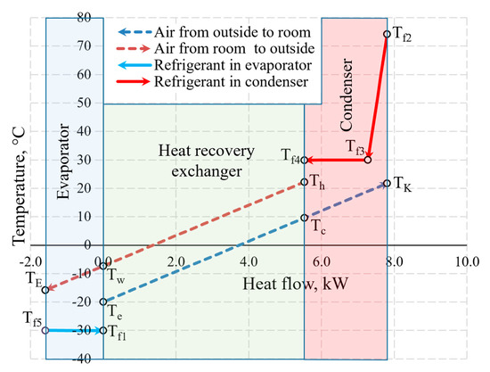 An integral chart of the variation of working fluids (air and Freon) of the AHU in the heat exchangers is shown in Figure 10. The depicted temperatures are within the range that is typical of processes of real-world ventilation and HP used for such ventilation. To the right of 0.0 on the x-axis the thermal input of the AHU is shown which is created by the HRE and the CN. To the left of 0.0 the thermal input of the evaporator that it receives from the exhausted air is shown.