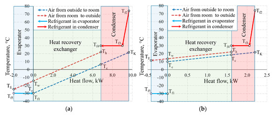 Temperatures in the heat exchangers and heat flows therein at outdoor air temperatures of (a) −30 °C; (b) +10 °C.