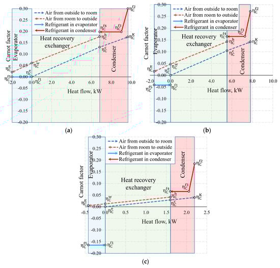 Carnot factors in heat exchangers and heat flows therein at outdoor air temperatures of (a) −30 °C, (b) −20 °C and (c) +10 °C.