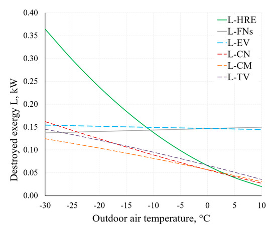 It is observed that the Carnot factor is 0 in all cases for the outdoor air that enters the HRE. It equals 0 for the evaporator as when = −30 °C. The area between the Carnot lines within the input of the heat exchanger or any other general inputs shows destroyed exergy, as demonstrated in Figure 5. The case for +10 °C, with its relatively large area, draws attention and poses an objective—the reduction of exergy losses in the evaporator when the outdoor air temperatures are higher.