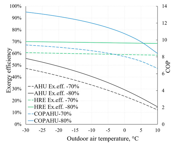 Exergy is a thermodynamic property, dependent on the state of the analyzed system and its surrounding environment, the so-called reference environment or, for thermal systems—reference temperature (RT). Determining exergy efficiency becomes complicated when RT varies and could be below, above or equal to the operating temperature of the working fluids, which is exactly the case for the AHU.