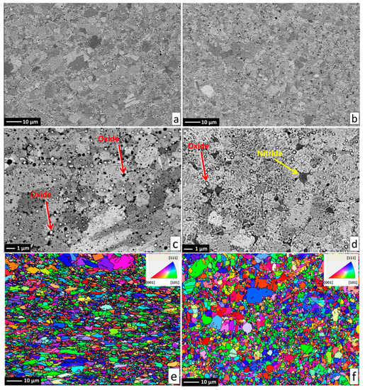 Figure 2e,f) demonstrated that after the SPS process, microstructures were fully recovered, indicated by a single-color (single crystallographic orientation) representation of each grain (should plastic strain be still present after the SPS, different shades of the individual colors would be visible within each grain). Pure CoCrFeMnNi and CoCrFeMnNi-N alloys possessed almost identical average grain size of the main FCC phase, quantified using the EBSD method to be 3.78 ± 1.16 μm and 3.53 ± 1.05 μm, respectively. The identical average grain sizes (considering given uncertainty) despite the presence of intergranular Cr