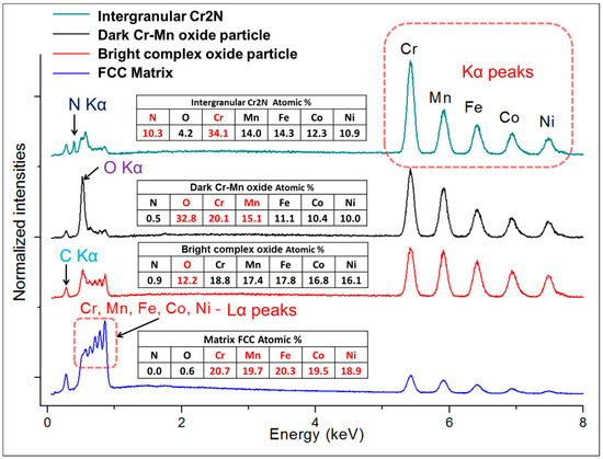 Figure 2c,d are mostly composed of chromium and manganese oxides, the white particles are also oxides. However, their spectra indicate a significantly lower oxygen content (12 at % vs. 33 at %) and higher quantities of the three heavier metallic elements (Fe, Co, Ni; see the spectra and respective compositions provided in