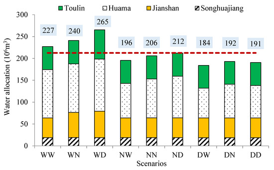 Water allocation for different subareas under different scenarios. (Note: (1) W—wet, N—normal, D—dry; (2) the first letter indicates the conditions of runoff and the second letter indicates the conditions of ETc; (3) the number inside the box means the total water allocation amount of different scenarios; and (4) the red dashed line is the average value of different scenarios).