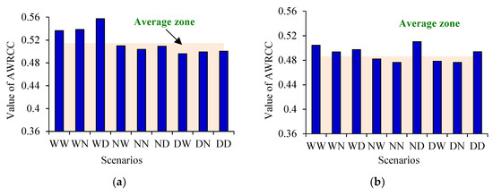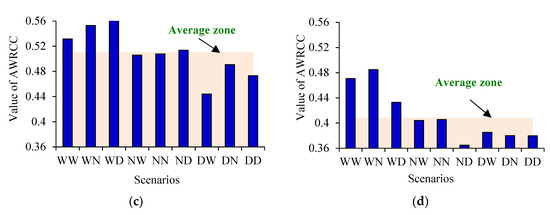 Agricultural water resource carrying capacity for different subareas. (a) Songhuajiang; (b) Jinshan; (c) Huama; and (d) Toulin. (Note: AWRCC means agricultural water resource carrying capacity).