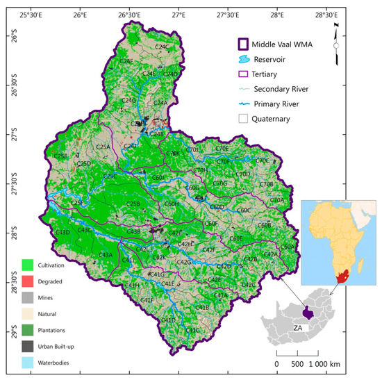 The Middle Vaal basin is located in South Africa, specifically between the Upper Vaal and Lower Vaal basins. It shares borders with the Crocodile (West) and Marico and the Upper Orange basins [34]. The Vaal River plays a major role as the main river in the Vaal region (Upper, Middle and Lower basins), which is the economic hub of Gauteng Province and of South Africa at large. Figure 1 shows the location of Middle Vaal basin, which is between 25°30’ and 28°30’ E longitudes and between 25°30’ and 29°30’ S latitudes. The map of Africa in Figure 1 has been added to give a context of the study area in the continent. Noticeable spatial fluctuations in climatic conditions, water availability, economic development and population distribution charasterise the Middle Vaal water management area.