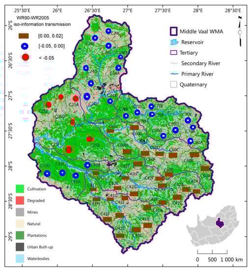 Spatial distribution of iso-information transmission for WR90-WR2005 in TCs (tertiary catchments) of the Middle Vaal basin or water management area (WMA).