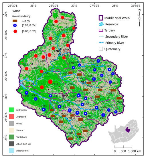 The Lower Vaal together with the Upper Vaal and Middle Vaal basins forms the current Vaal management area. Like [13,15], surface water resources (WR90) of South Africa 1990 (WR90), 2005 (WR2005) and 2012 (WR2012) data sets were used for MAR, specifically for the Middle Vaal. WR90, WR2005 and WR2012 data sets were considered in this study as the different phases of the water resources of South Africa. It should be noted that, in the history of hydrological appraisals of South Africa, studies are commissioned by WRC and the first comprehensive data set in its kind was WR90. This data set was commissioned in 1990 and completed in 1994. It provided valuable data and information for water resources planning and development [33], since then it has been adopted by users from different categories, such as students, researchers, engineering practitioners and consultants, government institutions, and water industry users [16]. In a period of 15 years later, another study of surface water resource appraisal was commissioned to update the first data set and yielded the WR2005, which was completed in 2011. In 2012, WRC initiated an update of WR2005 to give birth to WR2012, which was finalised in 2016. So far WR90, W2005 and WR2012 are the well documented hydrological phases and are freely ready available from WRC. Updating hydrological data is common since data and information impact on the decision making for the operation, planning and management of water resources. The MAR spatial distribution impacts on water resources management and development. Secondly, information redundancy is evaluated to establish the necessary information contained in each phase. The study also established a relationship between RCE and R, under specific conditions. Finally, a spatial distribution of information redundancy associated with MAR was also derived for the Middle Vaal basin, i.e., areas of the same redundancy called iso-information redundancy could be identified. The spatial distributions of information transmission derived specifically from RCE were also established. In this way, iso-information transmission zones can be determined.