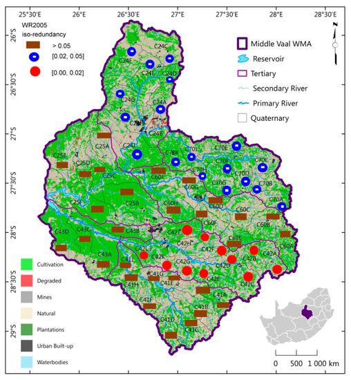Spatial distribution of iso-information redundancy of TCs for WR2005 in the Middle Vaal basin.