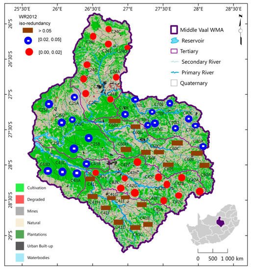 The spatial representation of RCE gave the determination of iso-information transmission maps for WR90-WR2005 and WR2005-WR2012. Hence the zones of the same RCE could be determined and analysed. Similarly, the iso-information redundancy maps of TCs in the Middle Vaal was determined and analysed for WR90, WR2005 and WR2012. There is no universal rule to define entropic zone values; hence they are usually determined arbitrarily as far as entropy related studies are concerned [5,13,44]. For that, the range of RCE (R) was arbitrarily divided into intervals to define zones of the same information transmission (information redundancy). The maps in this case could show the level of dispersion or concentration of MAR over TCs, and be used as an indicator to monitor catchment yield (MAR) distribution in terms of water resources.