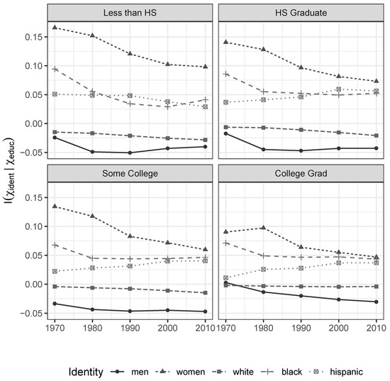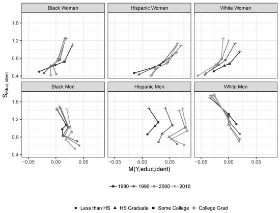 A large literature has provided evidence of the negative effects different forms of discrimination have on the incomes of members of certain social-identity groups [50,51,52,53,54,55]. One of the difficulties in grappling with the economic content and measure of those effects stems from the sheer complexity of the interrelationships involved in the determination of individual levels of income. Observable labor-market outcomes reflect the dynamic accumulation of educational, personal, and professional outcomes along an individual’s life [56,57,58,59]. The mechanisms and interactions linking any given observable individual characteristic and income are manifold, path-dependent, and very often unobservable. This includes the influence of discriminatory treatment, biases, and stereotypes in conditioning outcomes at all stages of those processes [60,61,62,63,64,65,66,67,68,69].