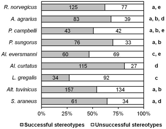 The ratios of successful and unsuccessful stereotypes of different species. Numbers indicate the number of stereotypes. The same letters (a, b, c, d, e) indicate no significant difference between species (p < 0.0014) according to Fisher’s exact test with Bonferroni amendment. Note that the number of successful stereotypes here is the same as within the raw data text files in Table 1.