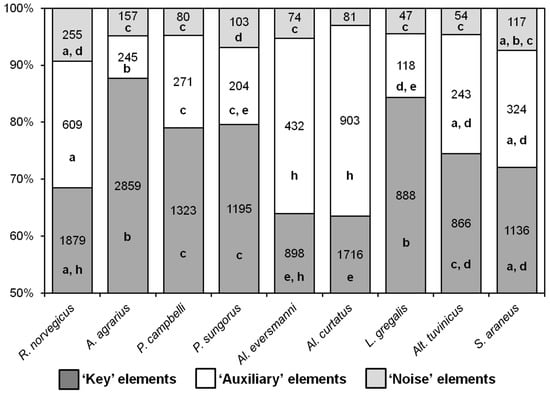 The proportion of different groups of behavioral elements in different species. Numbers indicate the number of elements. The same letters (a, b, c, d, e, h) indicate no significant difference between the same types of behavioral elements (‘Key’, ‘Auxiliary’, ‘Noise’) in different species (p < 0.0014) according to Fisher’s exact test with Bonferroni amendment.