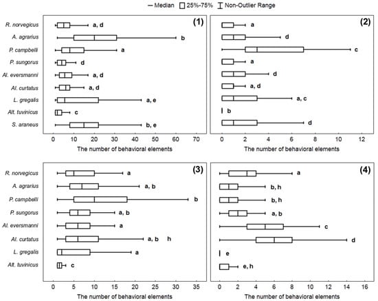 The Kruskal–Wallis criterion shows the presence of significant differences within all samples of behavioral elements: W (H = 287.8, p < 0.0001), E (H = 234.9, p = 0.0001), R (H = 322.9, p = 0.0001), H (H = 203.7, p = 0.0001). The highest number of “bites” per stereotype was most typical for A. agrarius, L. gregalis, and S. araneus. The hamster P. campbelli more often than other species studied committed acts of nibbling insects’ legs. R. norvegicus, Al. curtatus, and Al. eversmanni, more often than other species studied handled the prey with paws (see details in Figure 4).