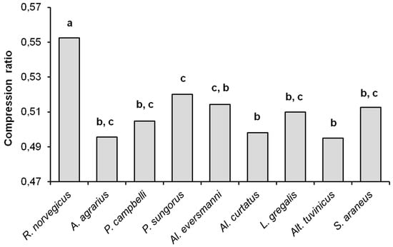 As noted before, the compression ratios of sequences can be considered characteristic of the complexity of the files being compressed. As can be seen from Figure 5, the compression ratio of sampled data files in R. norvegicus (the average value 0.553) differs significantly from all other species (U-test, p < 0.01), and thus has the highest complexity. The compression ratios in other species turned out to be similar and close to the ‘insectivorous standard’, that is, to S. araneus. The average value of the compression ratios were 0.496 in A. agrarius, 0.505 in P. campbelli, 0.520 in P. sungorus, 0.514 in Al. eversmanni, 0.498 in Al. curtatus, 0.510 in L. gregalis, 0.495 in Alt. tuvinicus, and 0.513 in S. araneus. The compression ratios in Al. eversmanni (Uemp = 0.5, Ucr = 2, p = 0.041) and in P. sungorus (Uemp = 0.0, Ucr = 2, p = 0.019) are higher than in Alt. tuvinicus, and in P. sungorus the compression ratio is higher than in Al. curtatus (Uemp = 7, Ucr = 9, p = 0.045).