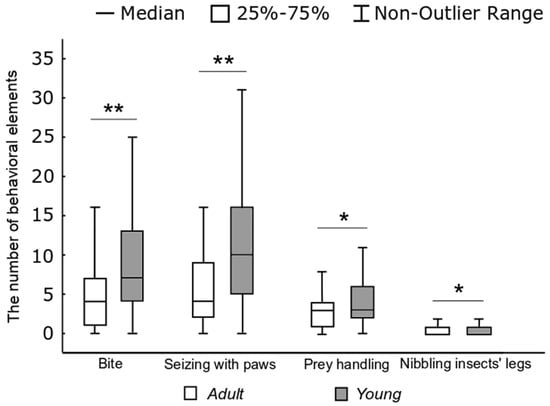 The number of behavioral elements in one hunting stereotype of adults and young rats (H-test, ** p < 0.01, * p < 0.05).