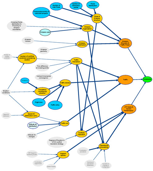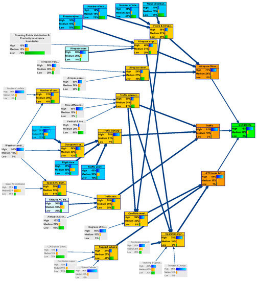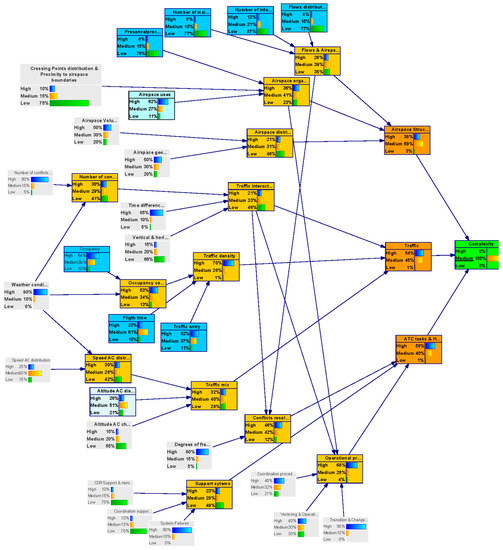 Uncertainty quantification deals with the conditional probabilities that quantify the relationships between variables. Conditional probability tables (CPTs) were obtained via expert’s elicitation as well from data and results in existing literature. Finally, the model validation checks the BN resulting from the two previous steps and determines whether it is necessary to revisit any of the previous steps. Validation followed a Model Walkthrough approach. It consisted of the use of real case scenarios that were prepared by domain experts to assess the predictions provided by the BN model. It determined up to what extent BN predictions correspond to the predictions experts would have made. Case scenarios have been elaborated from available studies applying current Air Traffic complexity models. A model walkthrough provides a subjective assessment of how good a model is perceived at providing or measuring what is expected of it [49]. If the results provided by the Bayesian network seem plausible for different hypothetical scenarios, this is interpreted as the goodness of the BN model’s output to capture the expectative of the stakeholders. We have also verified the adequacy of the outcome with case scenarios from literature not used for model building. In case of discrepancies, the model was recalibrated.