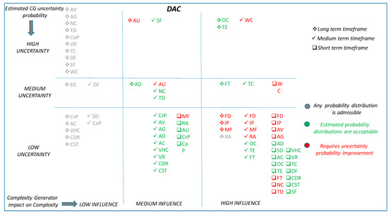 - Green: indicates that the uncertainty of a complexity generator, for the considered timeframe, may be acceptable.