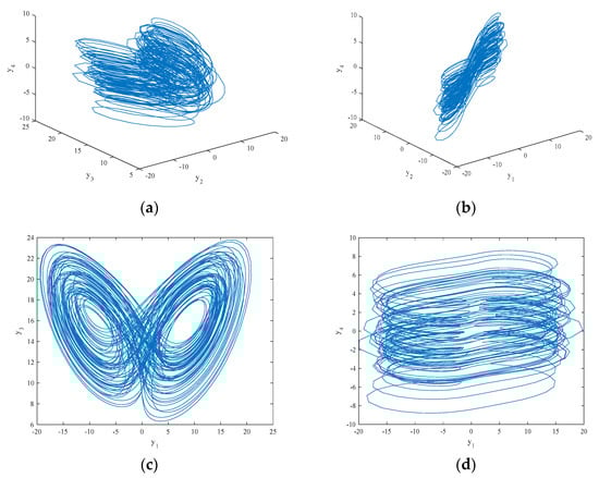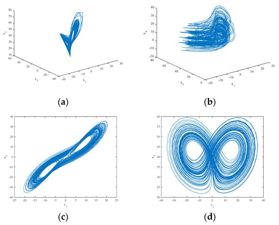 The projection of the chaotic attractor for the system (6): (a) in the space; (b) in the space; (c) on the plane; and (d) on the plane.